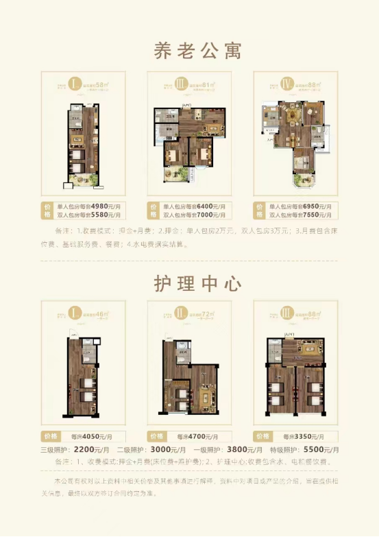为更好地回馈老年人,舜新养老公司将入住押金进行调整。养老公寓共四种户型,现已开放58㎡、81㎡、88㎡三种户型,每套公寓最多可入住两人,押金调至任一户型最高3万元/套,即单人入住养老公寓任一户型收取押金为2万元/套,双人入住养老公寓任一户型收取押金为3万元/套。护理中心有46㎡、72㎡、88㎡三种户型,分为两人间和四人间,现已全部投入使用。