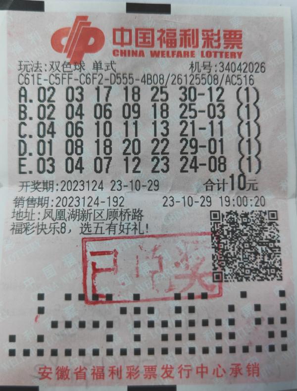 10月29日晚,福彩双色球第2023124期开奖,淮南中出1注双色球二等奖,单注奖金为105908元,花落淮南市凤台县凤凰湖新区顾桥路34042026号福彩投注站。