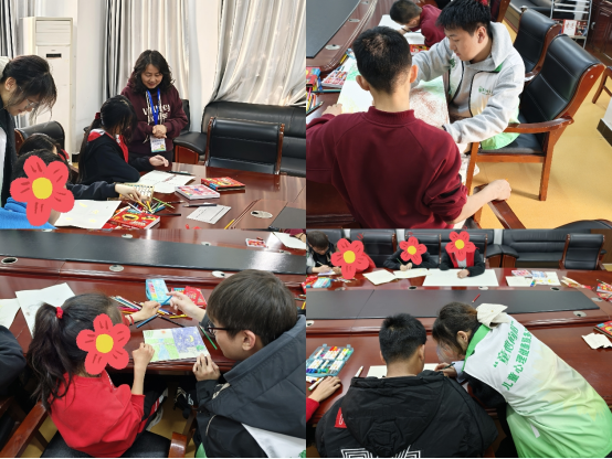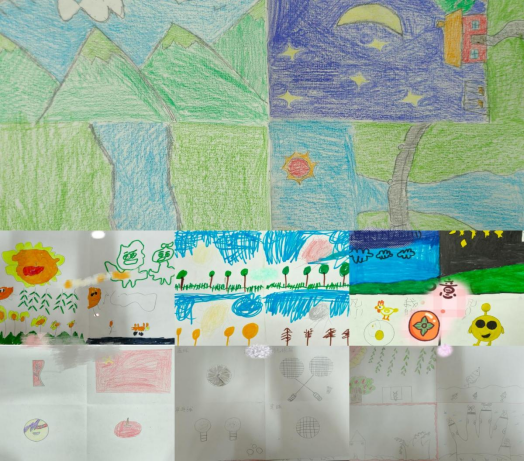 活动伊始,心理咨询师以温和亲切的语言引导孩子们进入创作状态,强调“绘画没有对错,只要表达自己就好”,为他们营造了一个安全、接纳的表达空 间。在志愿者的协助下,画纸与材料有序分发,活动在轻松愉快的氛围中正式拉开帷幕。在“分区绘画”环节,孩子们在八开画纸上绘制四宫格,自由描绘心情、喜爱的动物或想象中的场景,在安静的创作中逐渐敞开心扉。随后的“协作涂鸦”中,大家围坐共绘一幅集体作品,彼此在空白处补充线条与色彩,默契配合,既尊重他人的创作空间,又在互动中增强了合作意识与归属感,现场笑声不断。