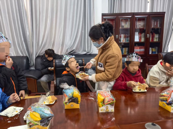 活动前,支部党员提前布置场地,精心准备了定制生日蛋糕和爱心零食。活动现场,在职党员、特教老师和保育员们为“寿星”们戴上生日帽,在温馨的生日歌声中,大家共同许愿、切分蛋糕,孩子们捧着香甜的蛋糕笑得格外灿烂,特困人员也露出了久违的笑容。期间,大家还与儿童和特困人员亲切互动,喂一些手脚不便的儿童吃蛋糕、陪孩子们做趣味小游戏、与特困人员唠家常,详细了解他们的日常生活和健康状况,将党组织的关爱落到实处。